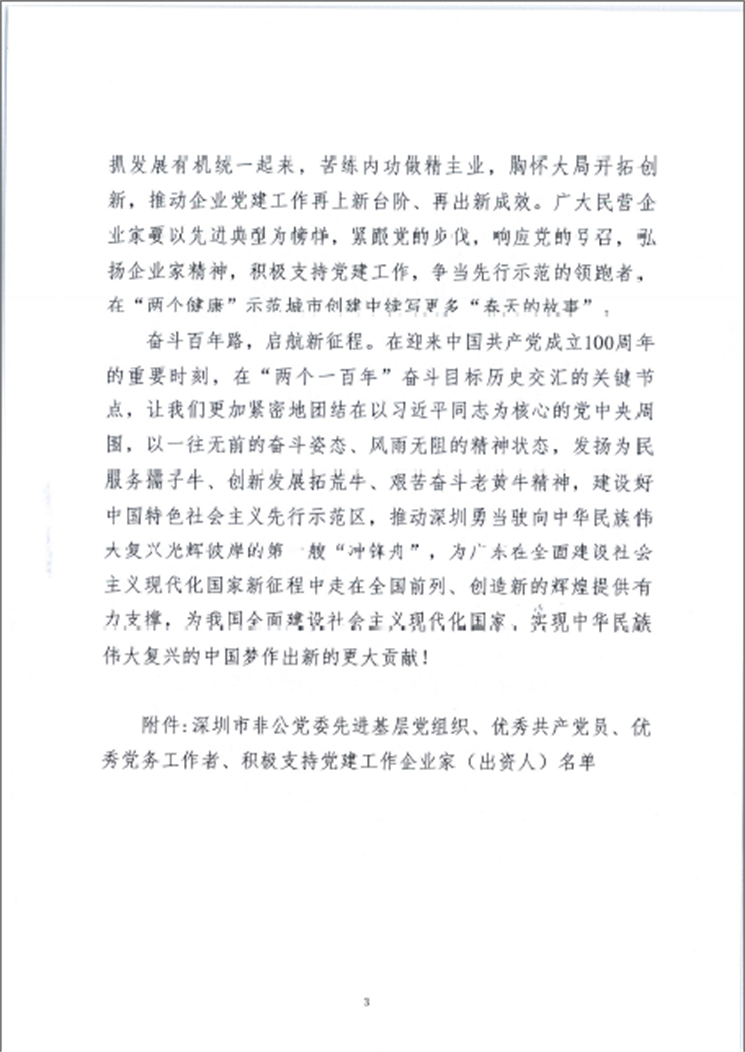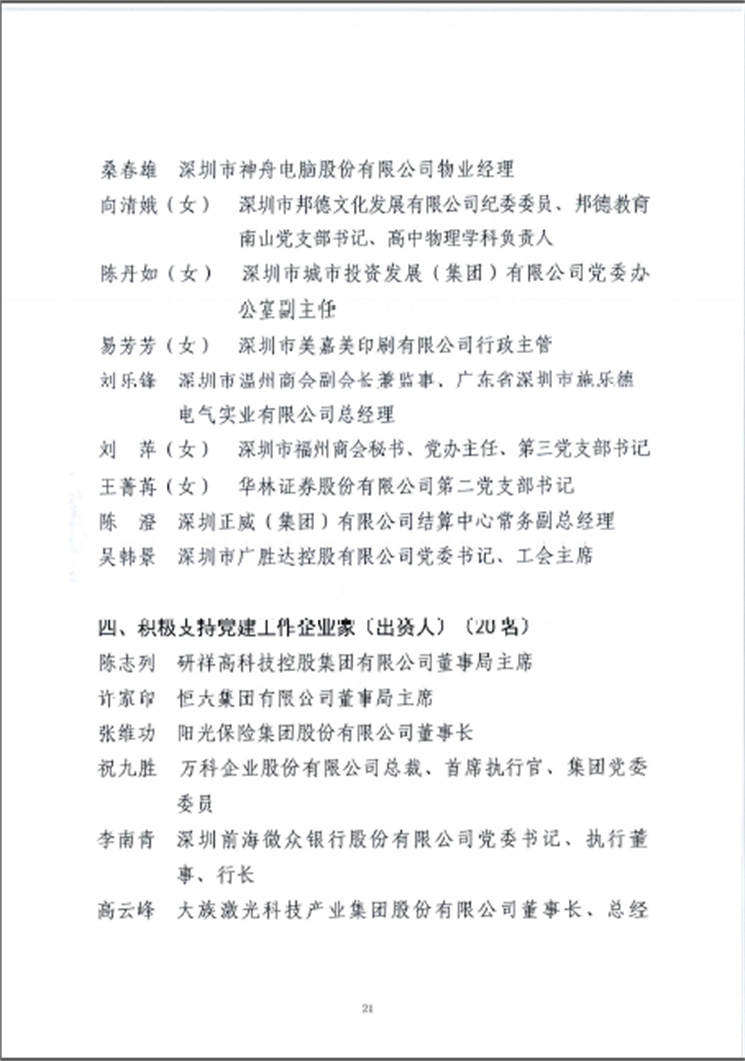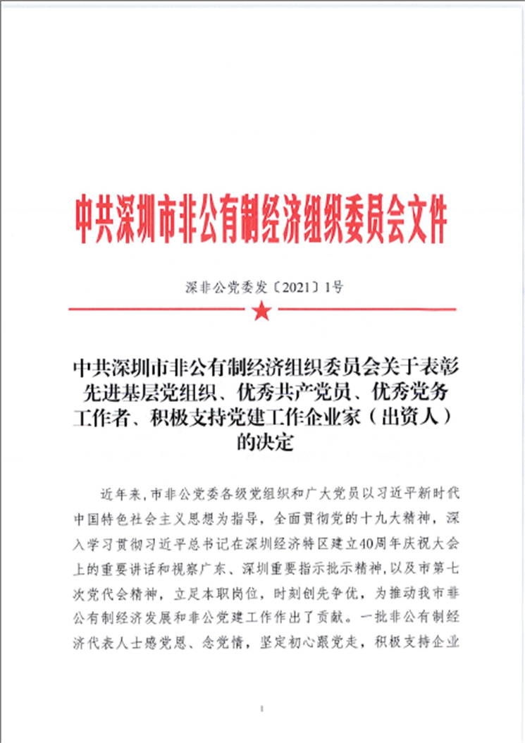 奮斗百年路,啟航新征程。在慶祝中國共產(chǎn)黨成立100周年之際,為表彰先進(jìn)、樹立榜樣,進(jìn)一步激發(fā)各級黨組織、廣大黨員的工作熱情,教育引導(dǎo)民營企業(yè)家愛黨愛國、積極支持黨建工作,2021年6月29日,深圳市非公黨委根據(jù)有關(guān)規(guī)定,經(jīng)逐級推薦、嚴(yán)格考察、征求意見和黨委會議研究審議等程序,授予海岸集團(tuán)董事長李奕標(biāo)、恒大集團(tuán)有限公司董事局主席許家印、深圳市東方明珠(集團(tuán))股份有限公司董事長吳開松、研祥高科技控股集團(tuán)有限公司董事局主席陳志列、萬科企業(yè)股份有限公司總裁祝九勝等20名同志“深圳市非公黨委積極支持黨建工作企業(yè)家(出資人)”稱號。
