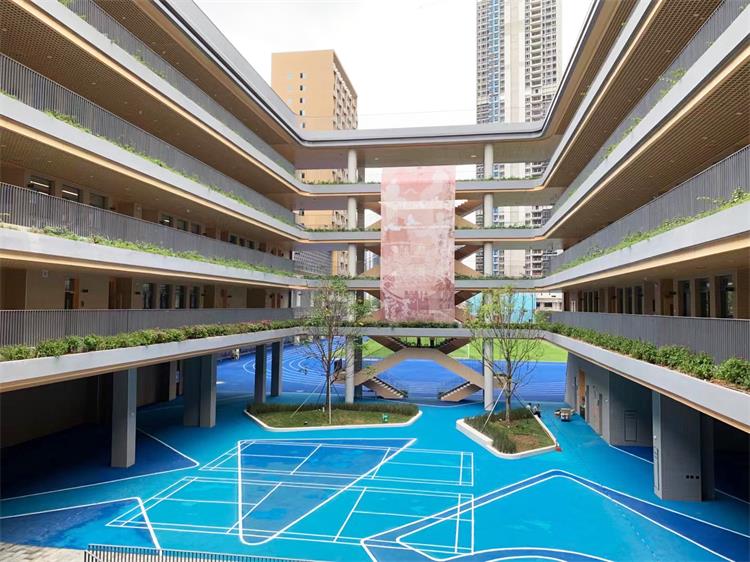 在建筑設(shè)計上,深圳外國語學(xué)校項目最初規(guī)劃項目用地被一條社區(qū)道路分為兩個地塊,北側(cè)為66班九年制學(xué)校,南側(cè)為36班小學(xué),兩所學(xué)校互相獨立。經(jīng)過一系列努力,政府各部門統(tǒng)一思想,項目創(chuàng)造性地在規(guī)劃上將兩個地塊合并為一所學(xué)校,實現(xiàn)互聯(lián)互通。學(xué)校地下二層完全打通,兩個地塊之間設(shè)置位于二層的跨街平臺,形成貫通南北的共享活動平臺,城市道路在平臺下方穿過,互不影響。建筑設(shè)計通過打通地下、空中兩個維度的聯(lián)系,使校園在不影響城市道路的情況下成為一個整體。